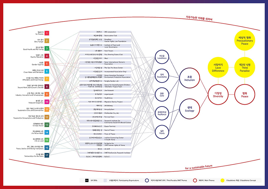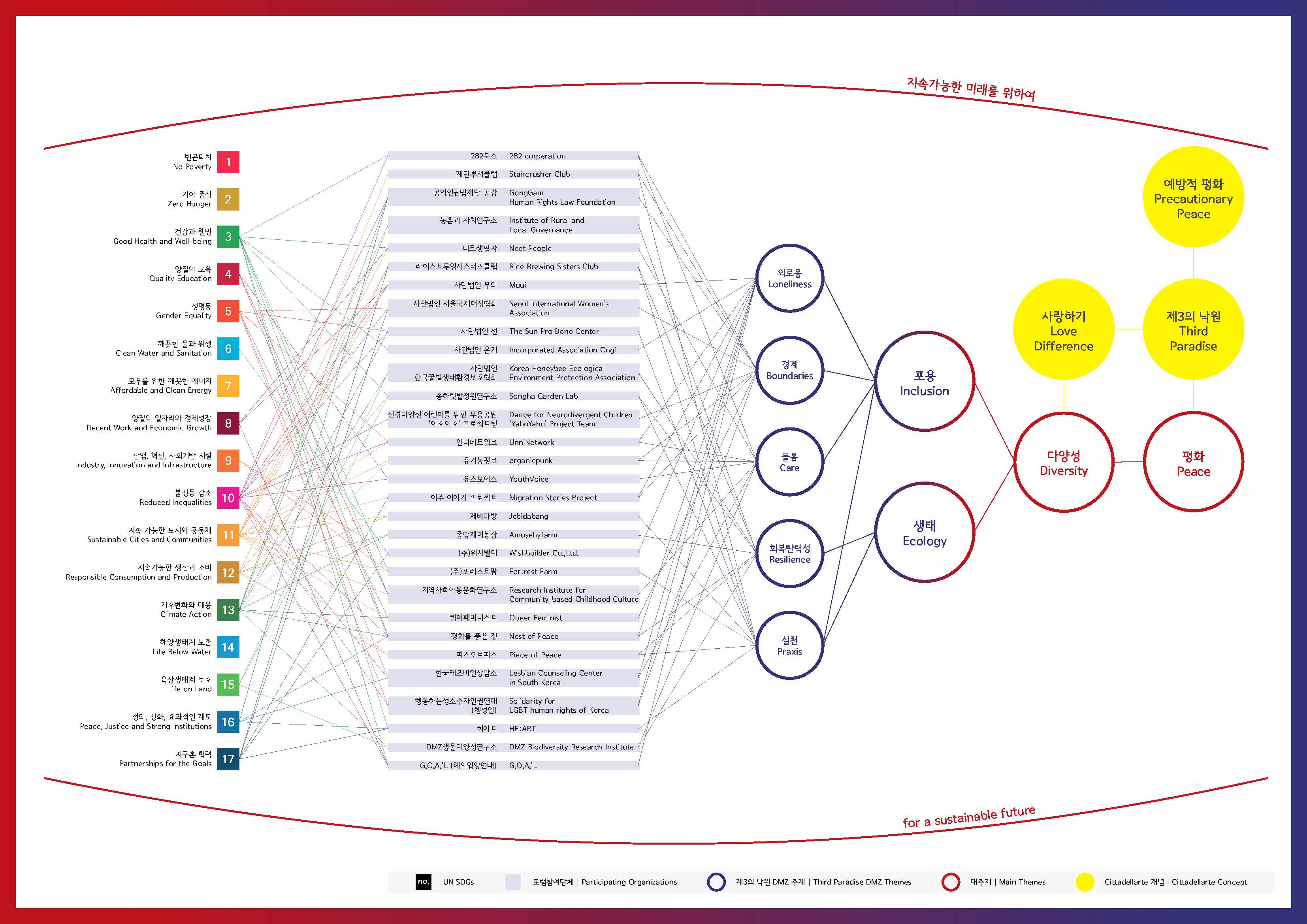 The forum will bring together more than 40 activists from 31 organizations in Korea working for Inclusion, Ecology, and Peace, contributing to a sustainable future. These individuals include civic activists, social entrepreneurs, field experts, researchers, and members of the Korean DMZ community, all aligning with the 17 UN 2030 Agenda for Sustainable Development. During the forum, the participants will exchange ideas on the forum's five themes and develop a shared action plan. This action plan will serve as a joint declaration embodying the multitude of voices and multitude of practical efforts to create the Third Paradise. The following joint declaration will serve as a starting point for each participant to continue their efforts in their respective positions even after the forum concludes. It will also work as a tool for Demopraxy, enabling everyone to jointly confirm and expand their ongoing efforts to ensure sustainability.